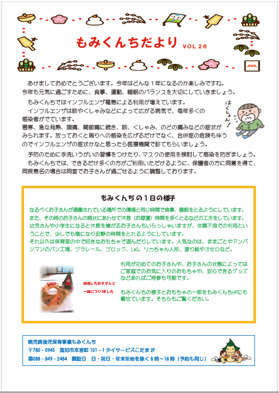 病児保育「もみくんち」から、子どもがかかりやすい感染症の流行状況や、病気に関する情報を発信しています。こちらではバックナンバーを含めて、PDFファイルで読むことができます。